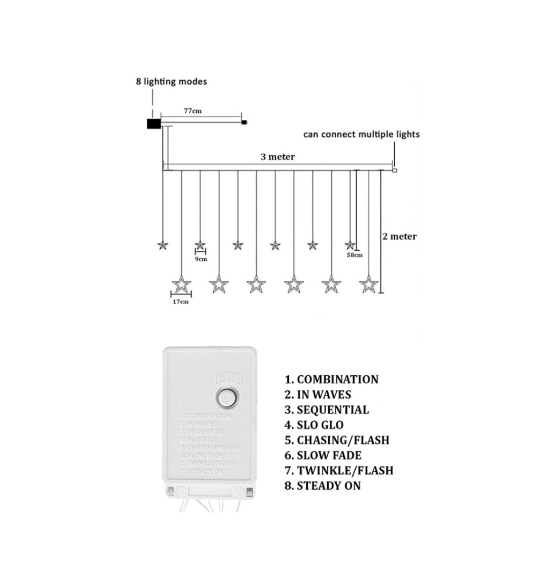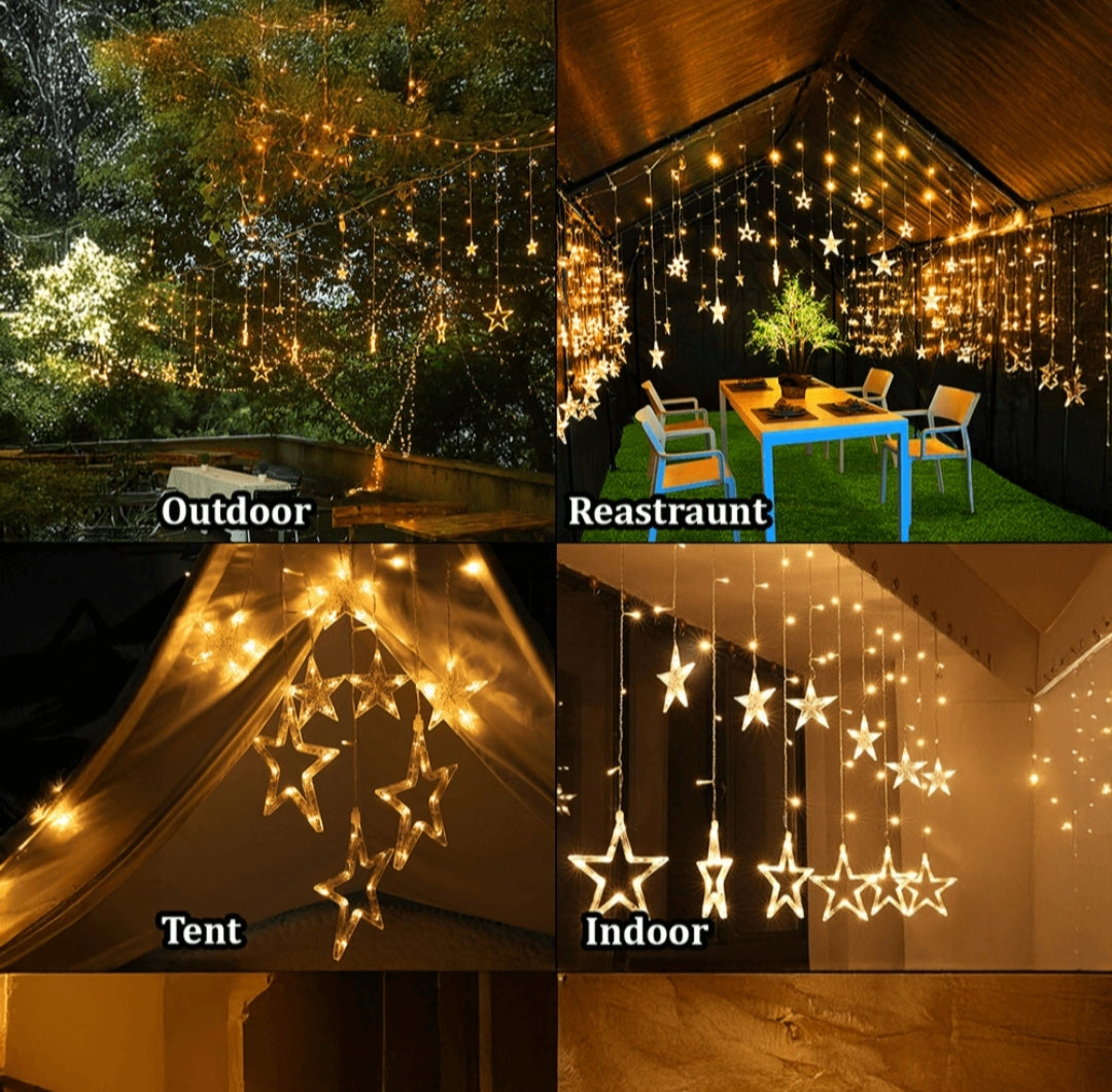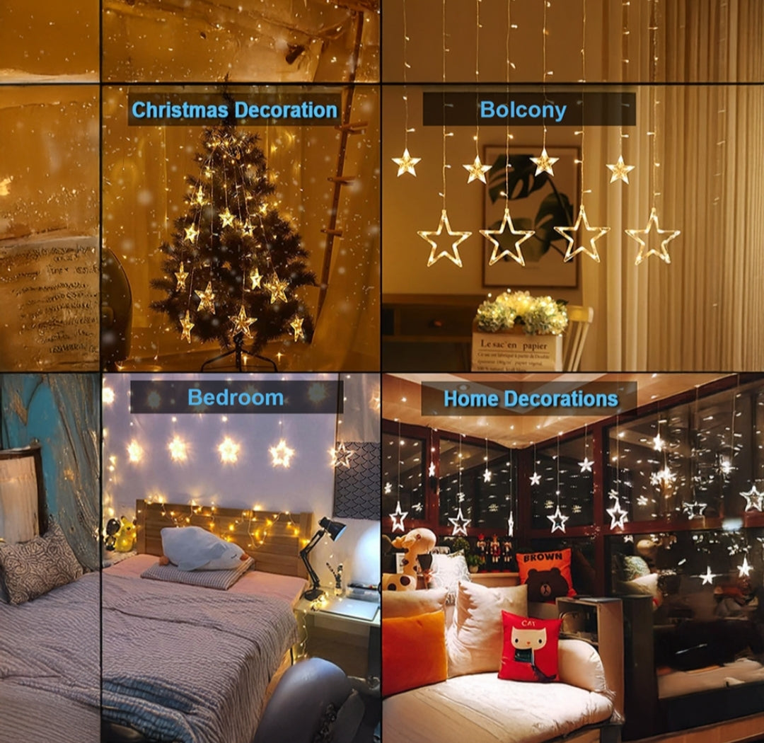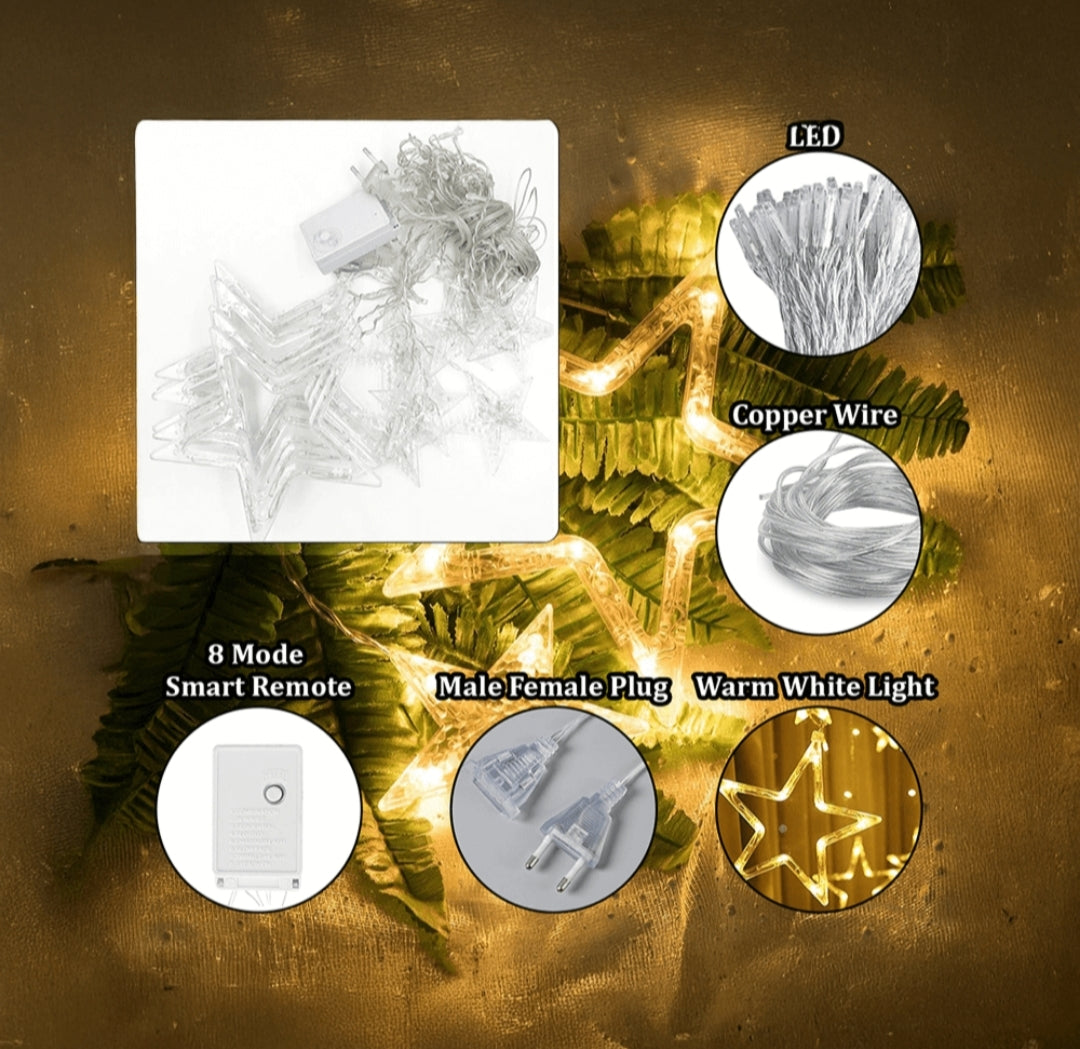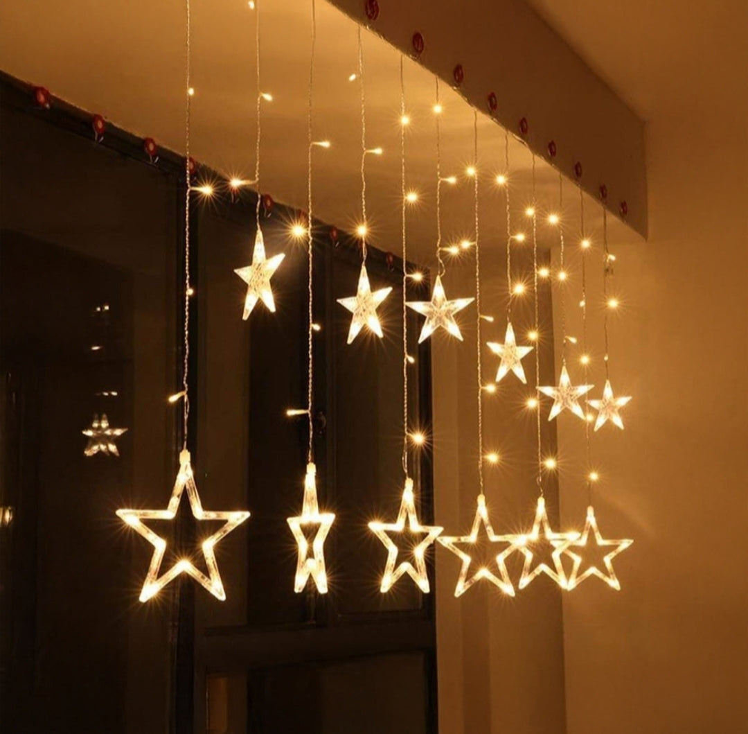 π 138 LED Star Curtain Lights β Includes 12 hanging stars with warm white glow, ideal for home, room, and festive decoration.
